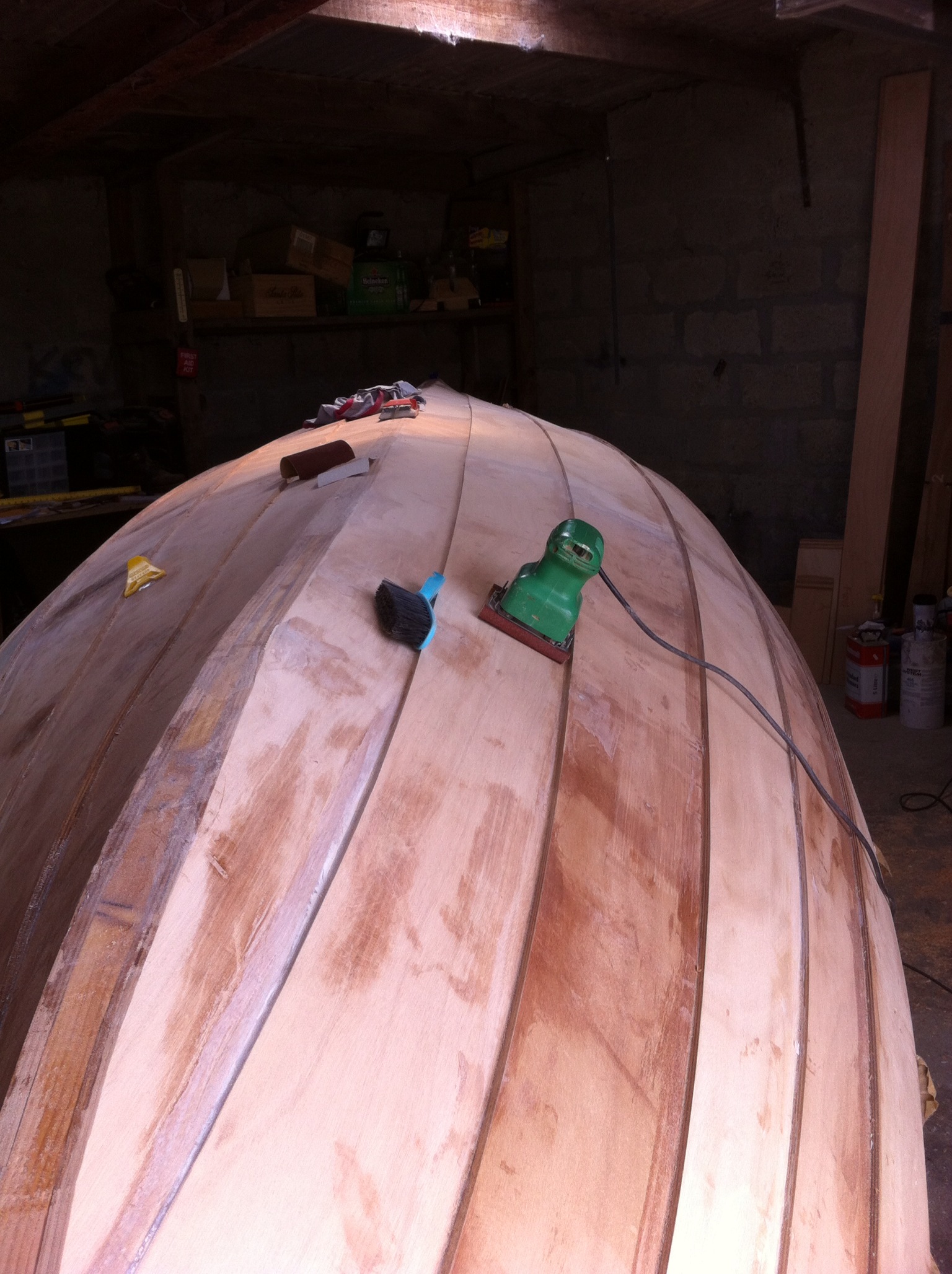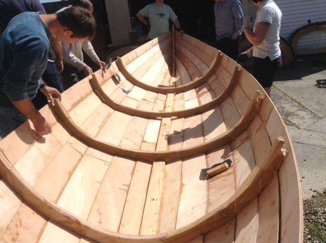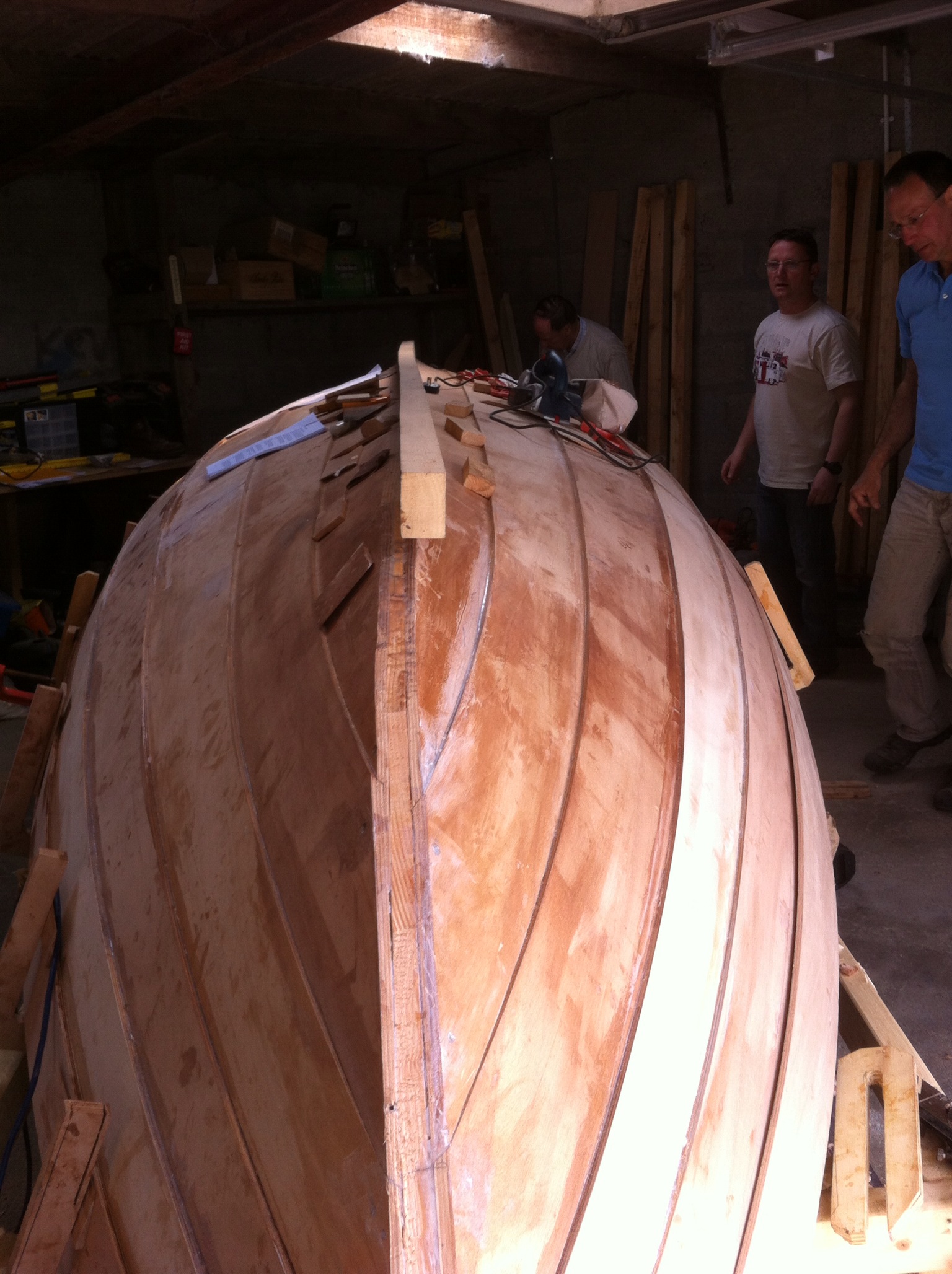 Many sessions later, after lots of drying time and sanding the planks are all in place and the keel band gets bolted on.